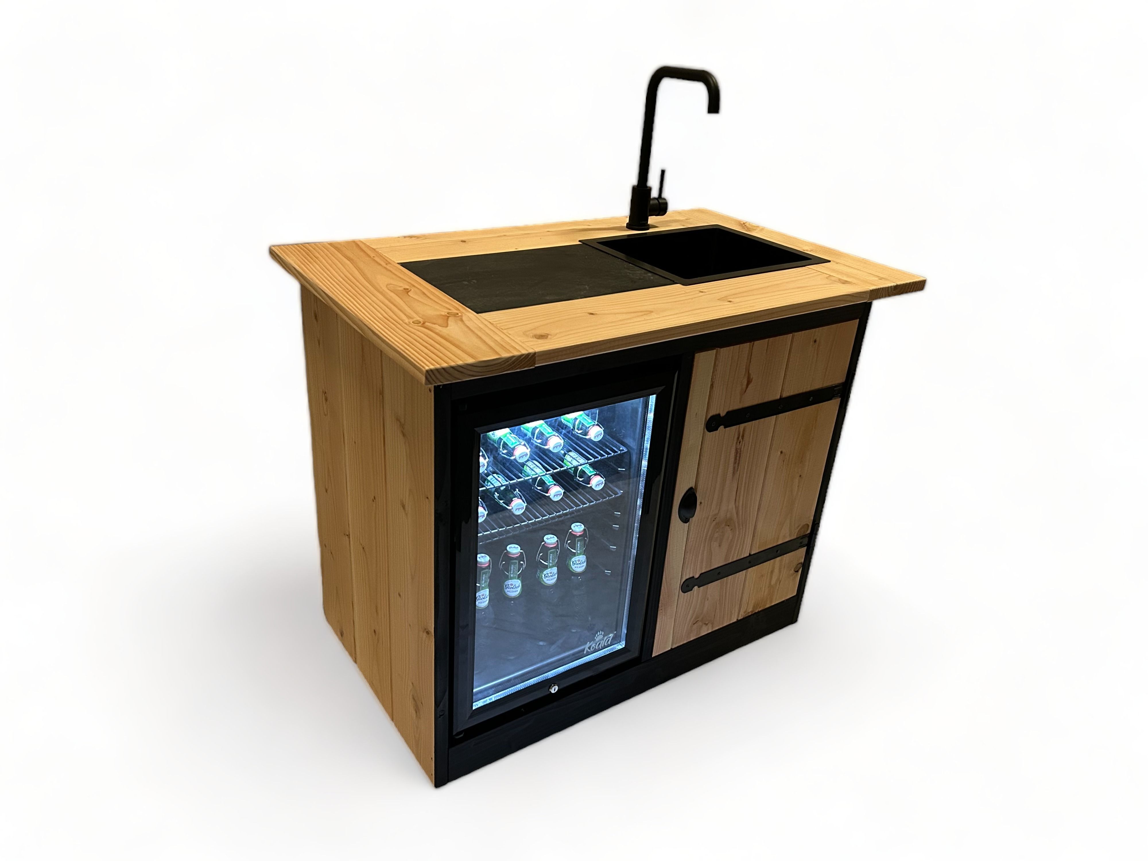 Ein Grill oder auch BBQ Ein Wasserhahn mit Spülbecken Ein Kühlschrank Ein Weinkühler Eine Schutzhülle