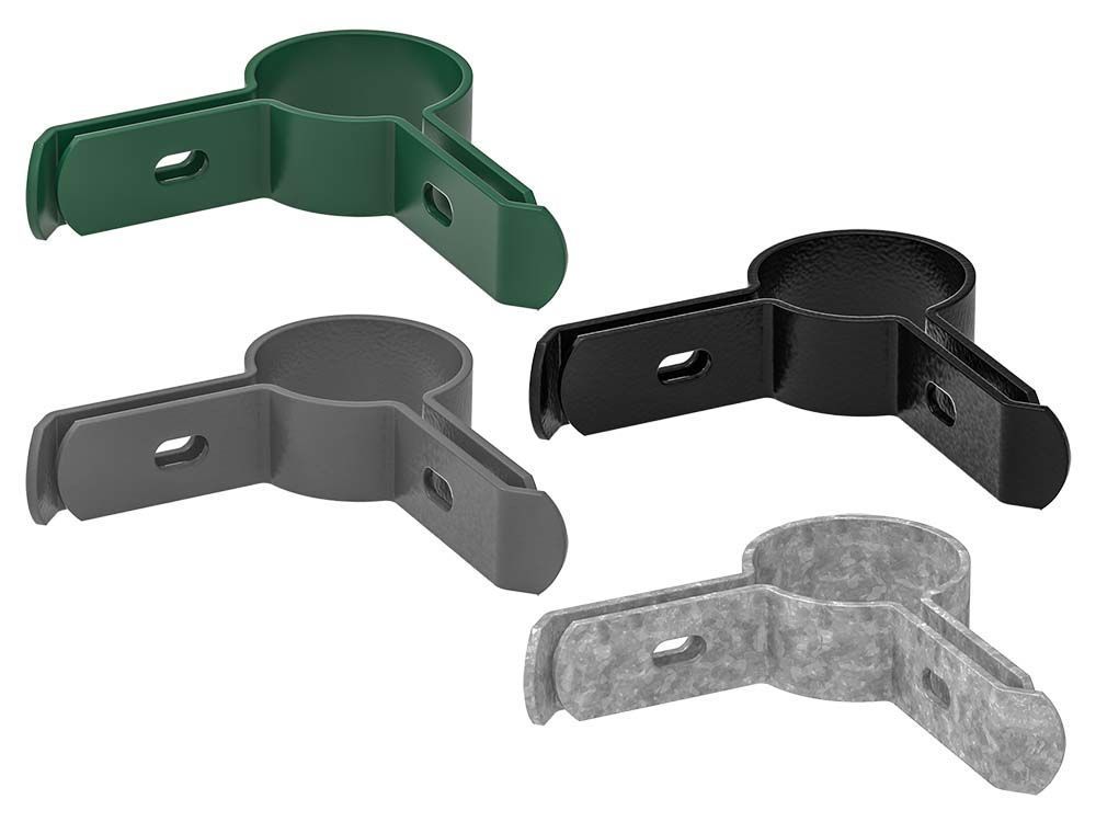 Für die glatten Blanko-Pfosten stehen verschiedene Befestigungssets (Schellen) zur Verfügung, mit denen der Einstabmattenzaun sicher an den Pfosten montiert werden kann.