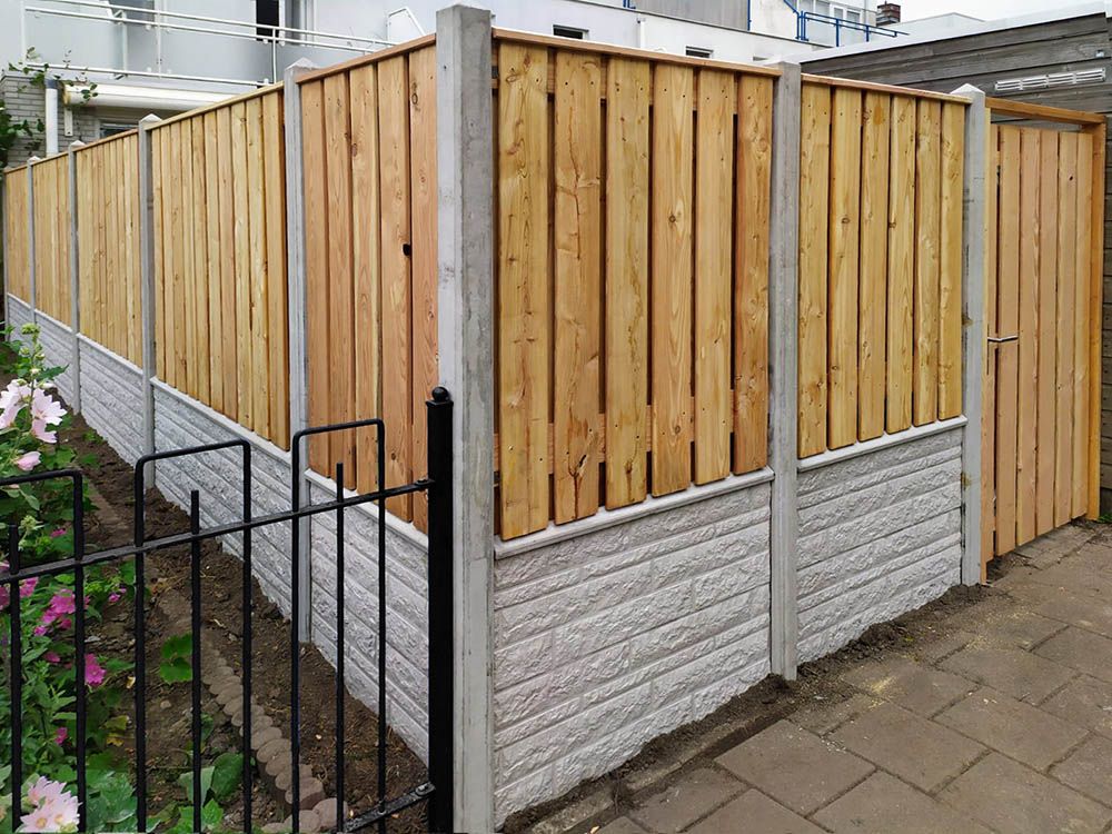 In den Betonpfosten befindet sich auf der Unterseite eine Furche für 1 Betonunterplatte. Die Unterplatte lässt sich sehr schön mit einem hölzernen 180x180 cm Holzsichtschutz kombinieren. Mit der glatten Unterplatte bekommt man so einen schönen, robusten Beton-Holz-Zaun mit einer Höhe von ungefähr 2 Metern.